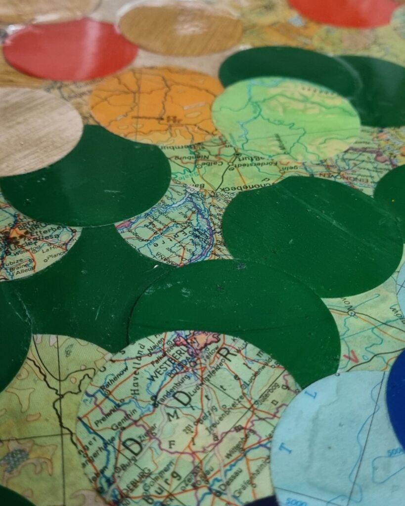 - Material: Flyer, Atlasseiten, Acrylfarbe, Sperrholzplatte, Holzleisten